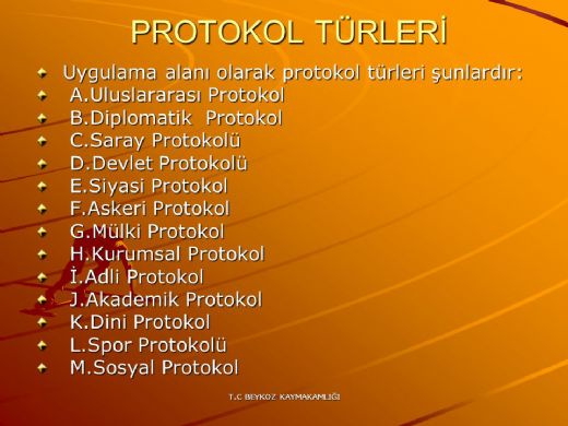 Diplomatik Protokol: Bu protokol ise uluslararası ilişkilerde, yabancı devlet temsilcileri ve diplomatik misyonların katıldığı törenlerde uygulanır. Elçiler, konsoloslar ve diğer diplomatik yetkililerin sıralamasına dikkat edilir. Diplomatik protokolde, bayrakların konumu, resmi karşılamalar ve hediye takdimleri gibi ayrıntılar büyük önem taşır.